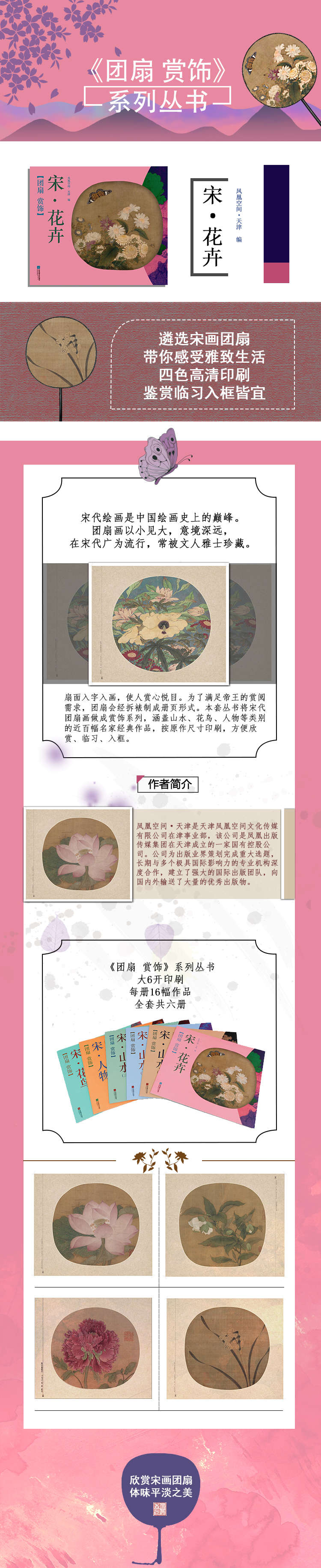 中國宋朝延續(xù)三百多年,民間繪畫、宮廷繪畫、士大夫繪畫各自形成體系,彼此間又相互影響、吸收、滲透,構成宋代繪畫豐富多彩的面貌。本系類叢書將宋代團扇畫做成賞飾系列,涵蓋山水、花鳥、人物等各類別,包括上百幅經典作品,原作尺寸、高清印刷,供廣大讀者及愛好者欣賞、臨習,亦可直接入框做裝飾用。如宋朝文人一樣,心中有山水,有一片屬于自己的山水。