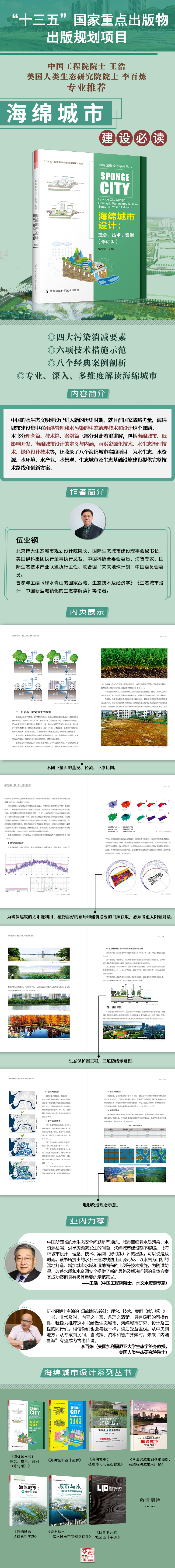全書分為理念篇、技術(shù)篇和案例篇三大章,理念篇對于海綿城市、低影響開發(fā)、海綿城市設(shè)計(jì)的定義與內(nèi)涵進(jìn)行了詳細(xì)介紹,技術(shù)篇介紹構(gòu)建海綿城市過程中涉及到的工程技術(shù)如雨洪資源化技術(shù)、水生態(tài)治理技術(shù)和綠色設(shè)計(jì)技術(shù)等,案例篇?jiǎng)t收錄了其團(tuán)隊(duì)近年來八個(gè)海綿城市實(shí)踐項(xiàng)目,景觀項(xiàng)目類型豐富,包括了濕地設(shè)計(jì)、水庫設(shè)計(jì)、水生態(tài)治理及水系設(shè)計(jì)等海綿城市構(gòu)建聚焦的項(xiàng)目。