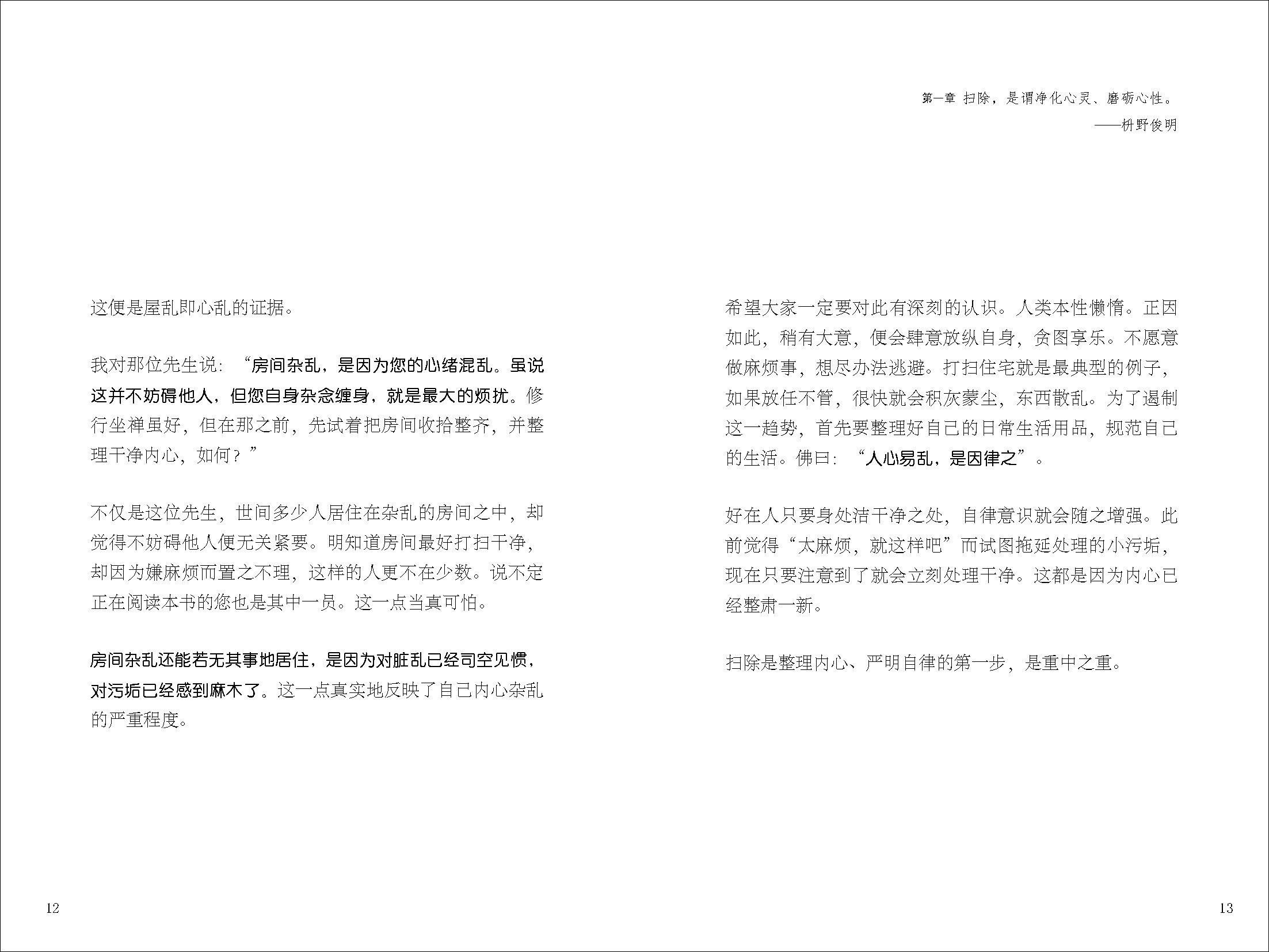 本書(shū)作者為日本禪學(xué)大師枡野俊明和掃除專(zhuān)家沖幸子,將禪學(xué)中掃除的智慧和歐洲極簡(jiǎn)整理術(shù)相結(jié)合,內(nèi)容共分為三章:第一章,枡野俊明分享掃除與調(diào)和心靈的作用,即通過(guò)打掃外部環(huán)境來(lái)整理內(nèi)心,去除不必要的執(zhí)著和雜亂的心緒;第二章,沖幸子分享許多實(shí)用整理術(shù)及歐洲經(jīng)驗(yàn),她指出掃除困難的原因是物品太多,進(jìn)而講述舍棄物品的準(zhǔn)則;第三章,枡野俊明與沖幸子對(duì)談,融合東西雙方關(guān)于掃除的觀點(diǎn)與訣竅,意在使讀者珍惜現(xiàn)有的一切,回歸豐饒的初心,獲得清爽簡(jiǎn)單的生活。