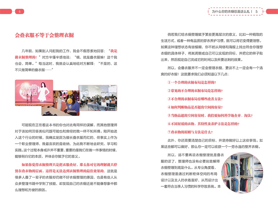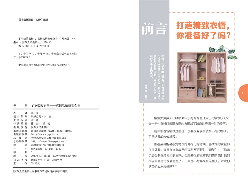在這本書中,整理師鄧美從選購衣櫥入手,到衣櫥的格局規(guī)劃、整理方法、清潔保養(yǎng)以及各類衣物的折疊、衣服的搭配、提升衣櫥品位等,全方位向讀者介紹關于衣櫥收納整理的內容。全書分為六章:為什么你的衣櫥總是這么亂,“扔”出來的精致衣櫥,提高衣櫥空間利用率的奧秘,學會這些你也可以做衣櫥布局規(guī)劃師,從衣櫥“納”出精致人生態(tài)度,整理讓生活更精致。