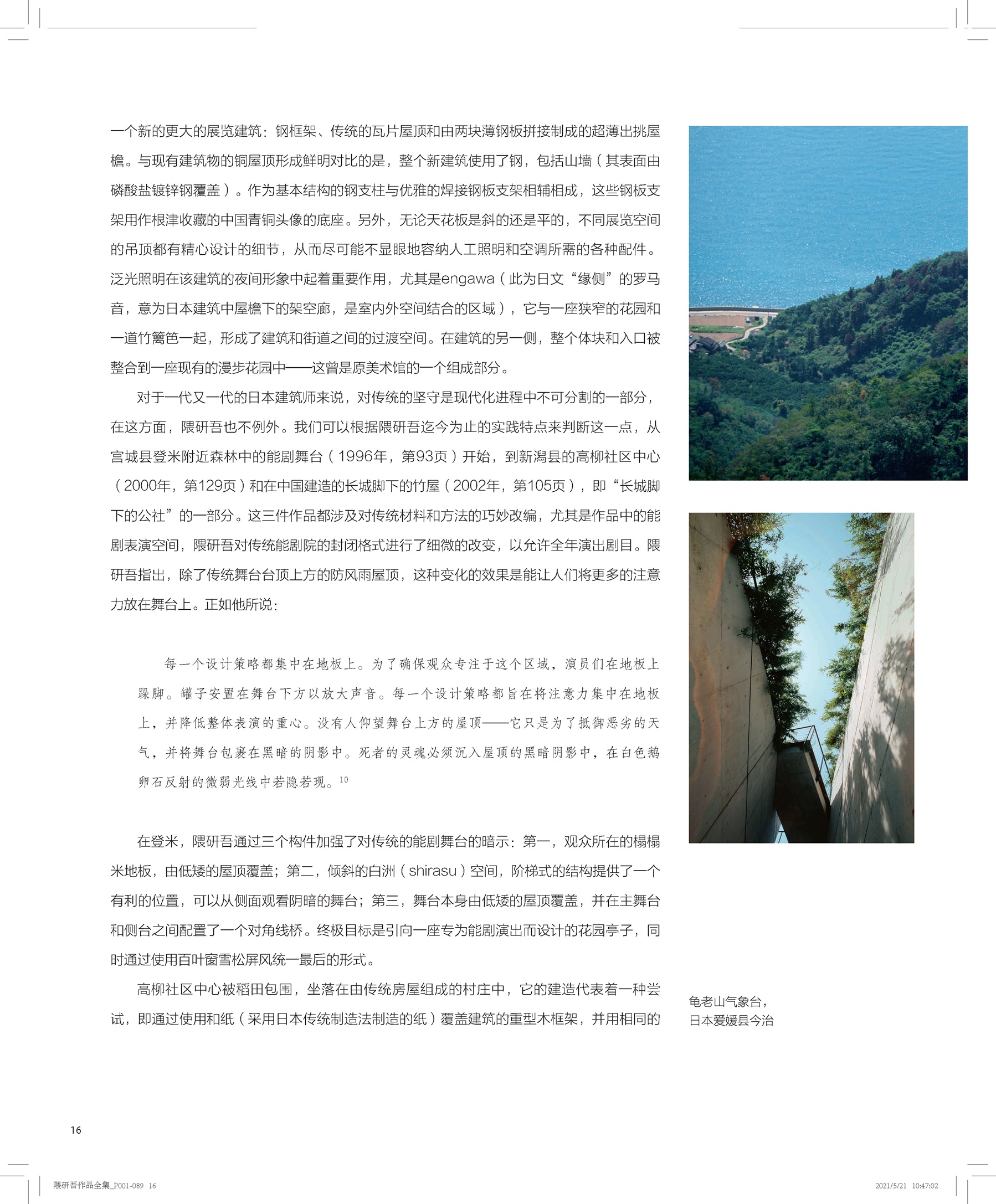 書(shū)中詳細(xì)介紹了:水/玻璃、河/過(guò)濾器、北上運(yùn)河博物館、森林與地板、Z58、玻璃/木、森林中的能劇舞臺(tái)、長(zhǎng)城腳下的竹屋、那珂川町馬頭廣重美術(shù)館、高柳社區(qū)中心、銀山溫泉浴室、銀山溫泉藤屋旅館、梼?cè)姓d、村井正誠(chéng)紀(jì)念藝術(shù)博物館、GC齒科博物館研究中心、梼?cè)袌?chǎng)、梼?cè)緲虿┪镳^、小松精練纖維研究所、在一個(gè)屋頂下、圣保羅日本屋蓮屋、Chokkura廣場(chǎng)、木佛博物館、知博物館、紙蛇、音戶(hù)町市民中心、根津美術(shù)館、卡薩爾格蘭德陶瓷之云、中國(guó)美術(shù)學(xué)院民俗藝術(shù)博物館、維多利亞和阿爾伯特博物館?鄧迪分館。