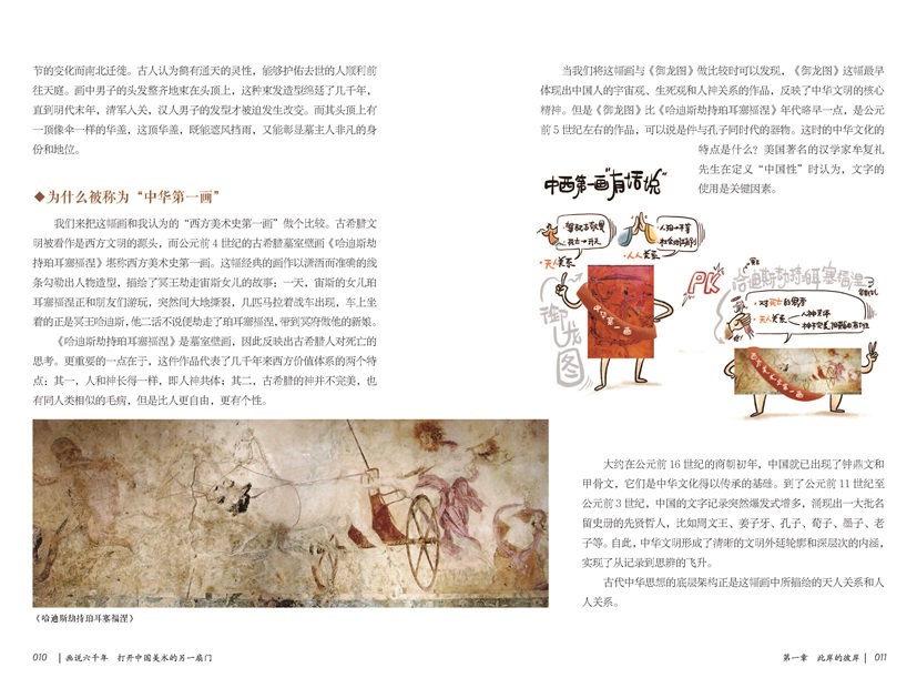 全書(shū)共分七章,第一章主要介紹了鸛魚(yú)石斧缸、御龍圖等展現(xiàn)古人生死觀的器物,探討中華民族追憶先祖這一文化習(xí)俗的歷史淵源。第二章細(xì)致講解了敦煌五百?gòu)?qiáng)盜成佛因緣圖壁畫(huà)、云岡大佛等佛教藝術(shù)在我國(guó)古代的發(fā)展。第三、四章圍繞宮廷藝術(shù)品,探討包括《女史箴圖》《韓熙載夜宴圖》等體現(xiàn)古代帝王生活樣貌的畫(huà)作。第五章借山水畫(huà),介紹作品與畫(huà)家間的關(guān)系,展現(xiàn)了作者的精神面貌與思想。第六章詳細(xì)介紹了《珊瑚筆架圖》《容膝齋圖》等藝術(shù)作品對(duì)新的書(shū)畫(huà)語(yǔ)言的探索與使用,展現(xiàn)了那些表達(dá)個(gè)性與特定感情的書(shū)法作品和文人畫(huà)接近19世紀(jì)起源于歐洲的現(xiàn)代藝術(shù)運(yùn)動(dòng)的藝術(shù)形式,也就是古代的現(xiàn)代。第七章則介紹了以《搜盡奇峰打草稿》《千巖萬(wàn)壑圖》為代表的17—19世紀(jì)具有獨(dú)創(chuàng)性的中國(guó)藝術(shù)作品,它們的出現(xiàn)打破了當(dāng)時(shí)中國(guó)藝術(shù)上保守陳舊的局面,創(chuàng)造了又一波中國(guó)美術(shù)創(chuàng)作的高光時(shí)刻。