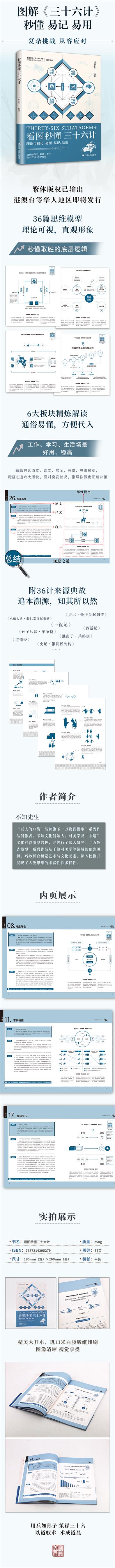 《三十六計(jì)》,或稱《三十六策》,是一部兵法奇書,語源于南北朝,成書于明清。記載了三十六條兵法計(jì)謀。本書是基于《三十六計(jì)》原著上,進(jìn)行視覺語言翻譯給讀者,輔助讀者延長記憶的時(shí)間,便于讀者去理解。書中每個(gè)章節(jié)主要包含:原文、譯文、啟示、總結(jié)、思維模型和規(guī)避之道這幾個(gè)部分組成,將艱澀的古代語言簡潔化、可視化,易懂、易記、易用。以精簡清晰的視覺解讀,來提煉核心思想,有助于讀者快速入門,從而啟迪智慧,提升認(rèn)知。